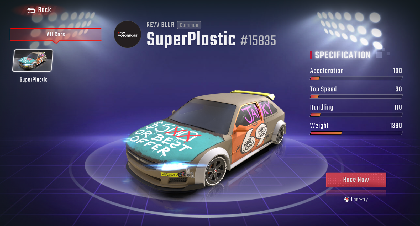 In order to race, every player needs a car. And since every car is a NFT, these need to be purchased with either REVV or ETH from OpenSea.