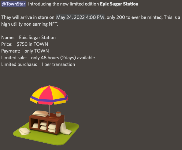 This enables a couple things. For one, decreasing the earnings utility of NFTs results in lower prices (such as from $1-2k to $500-700), which are still, of course, only purchasable via TOWN. Also, these non-earning NFTs can be sold in smaller quantities; the example below is selling only 200 copies at $750 in TOWN.